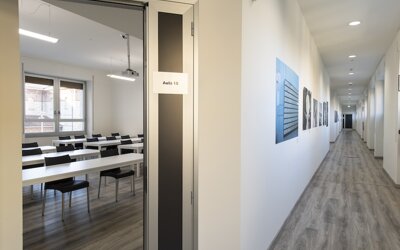 Via Tommaseo, via Sant'Eustacchio, via Montegrappa: la sede e i laboratori a pochi passi l'uno dall'altro. 8.000 mq di spazio, 450 corsi attivati, spazi all’avanguardia e laboratori remotizzati, Aula Magna, Teatro e Teatro di posa, 30 studenti in media per ogni corso, sinergie con aziende e istituzioni del territorio.