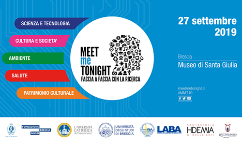 Anche quest’anno Accademia di Belle Arti di Brescia SantaGiulia partecipa all'evento “La Notte europea dei Ricercatori - Meet me tonight”, che si terrà in tutta la Regione Lombardia il 27 e 28 settembre 2019. A Brescia gli eventi saranno nella giornata di venerdì 27 settembre e Accademia SantaGiulia sarà presente in due momenti: