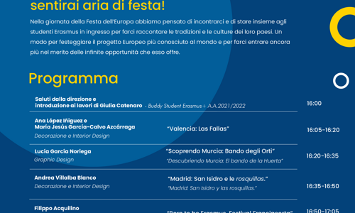 In data lunedì 9 maggio 2022, a partire dalle ore 16.00 presso l'aula 17 (secondo piano), gli studenti Erasmus+ racconteranno la festività tipica del Paese di provenienza mentre gli studenti di Accademia che hanno effettuato una mobilità Erasmus+ (Studio e Traineeship) racconteranno la loro esperienza all'estero.