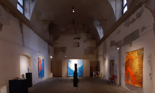 Pittore oltre che scultore, già affermato, l’autore ha compiuto “uno scavo fisico nella materia scultorea e metafisico negli ampi dipinti”. In questa doppia dimensione si realizza il dialogo tra i volumi scultorei e i teli dipinti appesi alle pareti.