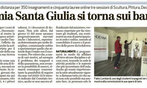 Riportiamo l'articolo del Brescioggi dell'11 giugno 2020 che da nota della parziale riapertura della sede dell'Accademia SantaGiulia, che inizia a ri-entrare nella quotidianità dopo 3 mesi di non-presenza in aula (ma presenza online in DAD), partendo dalle Tesi di laurea degli studenti di Pittura, Scultura e Decorazione che si stanno discutendo nei giorni 10-11-12 giugno 2020.