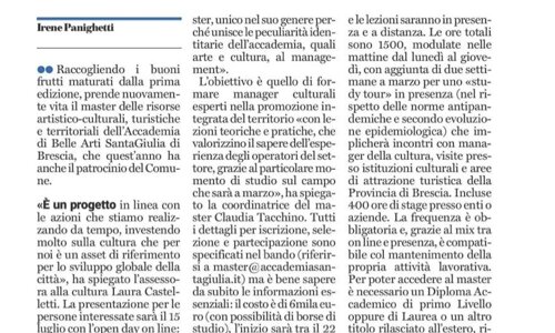 Riportiamo l'articolo pubblicato sul Bresciaoggi, in data 8 luglio 2021, che da spazio alla presentazione della seconda edizione del Master in Management delle risorse artistico-culturali, turistiche e territoriali proposto dall'Accademia SantaGiulia.