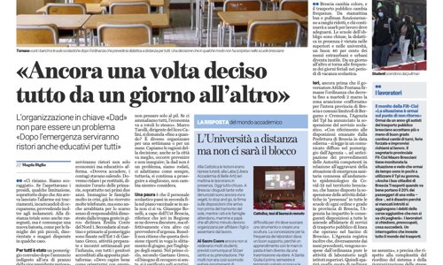 Alleghiamo la pagina 11 del Bresciaoggi del 24 febbraio 2021 che da spazio al mondo della scuola durante la fase epidemiologica di febbraio 2021. Siamo citati nel pezzo dedicato alla risposta delle università bresciane alla situazione attuale; l’articolo si conclude con un virgolettato della prof.ssa Casaschi.