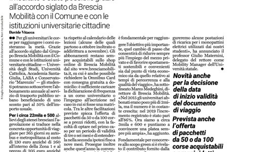 Riportiamo l'articolo del Bresciaoggi del 26 luglio 2022 che da spazio alle agevolazioni, per studenti degli ateni universitari bresciani, sull'abbonamento dei trasporti pubblici urbani.