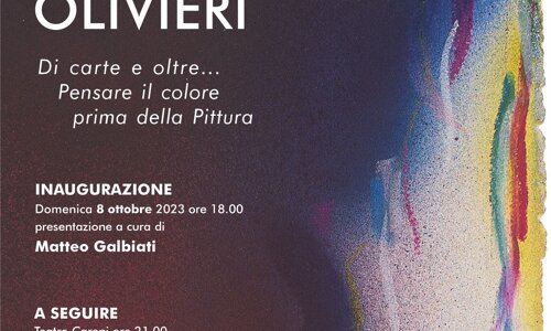 "Claudio Olivieri. Di carte e oltre… Pensare il colore prima della Pittura" raccoglie, per la prima volta con una visione così ampia ed estesa, la testimonianza dell’importante lavoro su carta di Olivieri, analizzandone il decorrere incessante dagli anni Cinquanta fino al secondo decennio dei Duemila. La volontà dell’artista è sempre stata quella di utilizzare – con una variegata possibilità espressiva di tecniche differenti – il supporto del “foglio” come catalizzatore di pensieri, energie, racconti tutti incanalati nella necessità di mettersi in atto, come immagini, attraverso il colore.