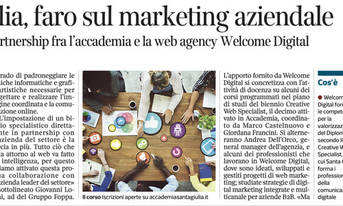 Riportiamo la notizia, data da Corriere della Sera del 13 novembre 2019, della partnership di Accademia SantaGiulia con l'azienda specializzata in comunicazione digitale Welcome Digital per il biennio di Creative Web Specialist.
