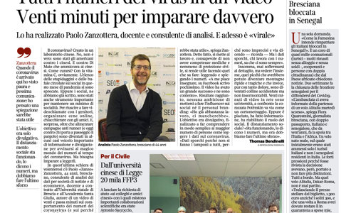 Alleghiamo l'estratto da pagina 5 del 2 aprile 2020 del Corriere della Sera (Brescia) che ha dato nota del video-data realizzato da Paolo Zanzottera, docente dell'Accademia SantaGiulia, e che sta diventando "virale" sul web con oltre 100 mila visualizzazioni. Il video spiega il comportamento del Covid 19 in cifre.