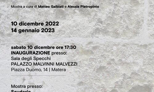 Sabato 10 dicembre 2022, alle ore 17:30, presso la Sala degli Specchi di Palazzo Malvinni Malvezzi (Piazza Duomo, 14) a Matera, inaugura la mostra «FЯAGILE. Pensieri sul crinale»: mostra d’arte contemporanea collettiva – nata come progetto di Tesi Specialistica del Biennio di Comunicazione e Didattica dell’Arte di Alessia Pietropinto, laureanda dell’Accademia di Belle Arti di Brescia SantaGiulia – che vede partecipi quattro artisti italiani già affermati con esperienze internazionali.