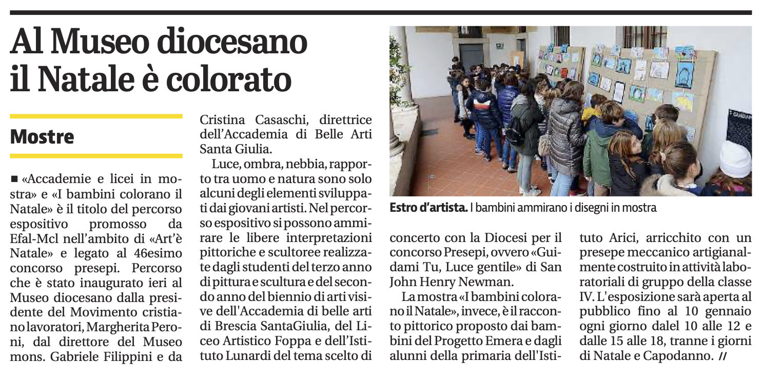 Alleghiamo l'articolo pubblicato sul Giornale di Brescia del 21 dicembre 2019 che da nota della mostra delle opere di studenti di Pittura, Scultura e Arti visive esposte al Museo Diocesano di Brescia fino al 10 gennaio 2020.