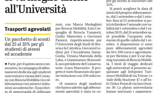Riportiamo l'articolo del Giornale di Brescia, a seguito della conferenza tenuta a Palazzo Loggia il 3 settembre 2019, dedicato alle agevolazioni e scontistiche, variabili dal 25 al 35% per gli studenti di atenei ed accademie, ai mezzi pubblici e ai servizi di sharing messi a disposizione dal Comune di Brescia e Brescia Mobilità.