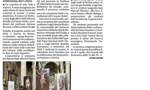 Riportiamo l'articolo del Giornale di Brescia pubblicato il 27 febbraio 2022, a seguito della inaugurazione della mostra del progetto Corpus Christi, esposto fino al 3 aprile presso la Chiesa del Carmine a Brescia.