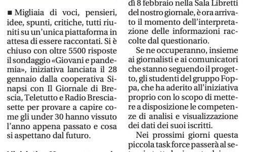 Alleghiamo l'articolo pubblicato dal Giornale di Brescia il 17 febbraio 2021, nel quale si da spazio al sondaggio "Giovani e la pandemia", i cui risultati saranno raccolti ed laborati anche con l'aiuto della nostra Accademia e di altri studenti delle realtà del Gruppo Foppa.