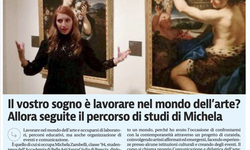 Riportiamo l'articolo del Giornale di Brescia, sezione Lavoro, dell'1 giugno 2020, che da spazio al racconto del percorso di studi di Michela Zambelli, riuscita a concretizzare passione e studio in lavoro, in linea con il percorso formativo intrapreso all'Accademia SantaGiulia.