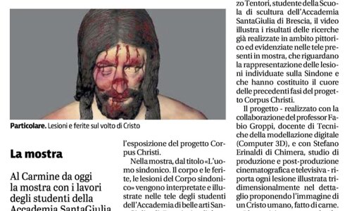 Riportiamo l'articolo del Giornale di Brescia del 13 febbraio 2022 che da spazio all'esposizione del progetto Corpus Christi presso la chiesa di Santa Maria del Carmine a Brescia. Il progetto, arricchito di un nuovo step, sarà in mostra fino al 3 aprile 2022 - l'inaugurazione è prevista sabato 26 febbraio 2022.