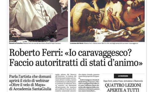 Riportiamo la pagina Cultura&Spettacoli del Giornale di Brescia del 30 marzo 2021, interamente dedicata al nuovo ciclo di incontri dell'Accademia SantaGiulia "Oltre il velo di Maya" (tutti moderati da Matteo Galbiati, Docente, Curatore e Critico) che apre con l'ospite Roberto Ferri, Artista contemporaneo di fama internazionale, e seguirà con Frani, Arrivabene e Mastrovito, nomi altrettanto eccellenti.
