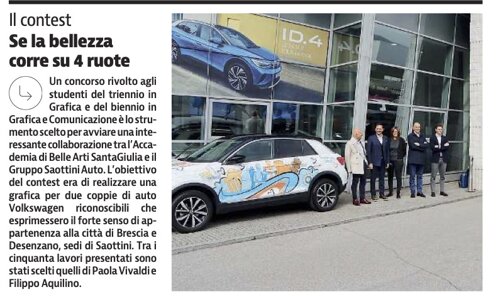 Riportiamo l'articolo estratto dal Giornale di Brescia del 9 ottobre 2021 che da spazio alla presentazione delle 4 automobili Volkswagen di Saottini Auto, che sono state wrappate a seguito della progettazione grafica, realizzata da parte di due studenti dell'Accademia SantaGiulia, che prevedeva un'operazione di design che restituisse il senso di apparteneza dell'Azienda (parte del Gruppo Eurocar Italia, azienda internazionale) al territorio bresciano, nello specifico alla città di Brescia e Desenzano del Garda. I vincitori del contest sono paola Vavaldi e Filippo Aquilino.