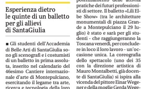 Il Giornale di Brescia del 21 luglio 2021 da spazio alla collaborazione dell'Accademia SantaGiulia con il Cantiere internazionale d'Arte di Montepulciano: gli stiudenti dei bienni specialistici delle Scuole di Scenografia e tecnologie dello spettacolo e Decorazione Artistica hanno realizzato i costumi e un oggetto di scena per lo spettacolo "Lili Elbe Show" che andrà in scena il 29 luglio 2021.