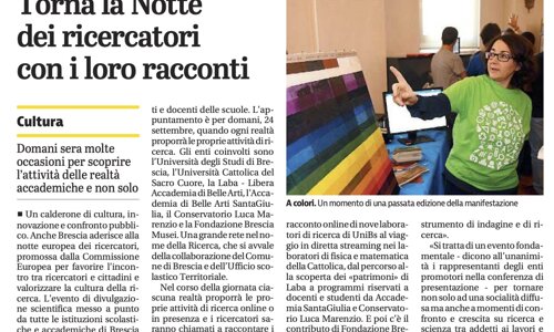 In allegato l'articolo del 23 settembre 2021 del Giornale di Brescia che da nota delle attività previste per gli Atenei e le Istituzioni AFAM di Brescia in occasione della Notte europea dei ricercatori del 24 settembre. Le attività di Accademia SantaGiulia si terranno in condivisione con il Conservatorio Luca Marenzio e saranno suddivise in attività laboratoriali per gli studenti, e di confronto per i docenti e le altre Istituzioni AFAM regionali.