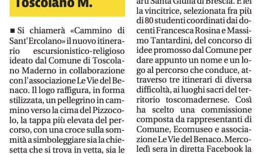In allegato l'articolo, del Giornale di Brescia del 12 marzo 2021, che da nota della realizzazione da parte della Scuola di grafica dell'Accademia SantaGiulia del logo per il nuovo cammino-trekking sul Garda realizzato e promosso dalla collaborazione fra Comune di Toscolano Maderno e Associazione Le vie del Benaco.
