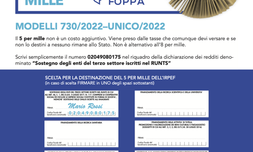 Per questo Ti chiediamo nella prossima dichiarazione dei redditi di destinarlo a noi, indicando nel riquadro denominato “Sostegno degli enti del terzo settore iscritti nel RUNTS” il codice fiscale 02049080175 e apponendo la Tua firma sul modello di dichiarazione utilizzato CU-730/1 – UNICO.