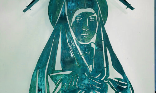 Gli studenti - ispirati dalla nota opera dell’Annunciata di Palermo di Antonello da Messina - hanno realizzato una Madonna in rame, patinata con una colorazione variabile di verdi-blu-turchesi che potesse sposare al meglio il contesto integrandosi con esso e creando giochi di ombre al variare della luce diurna, donando così una tridimensionalità scultorea dell’opera. La figura sacra è inoltre adagiata su una mensola sulla quale gli ospiti potranno appoggiare piccoli segni devozionali.