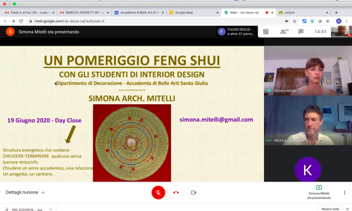 Venerdi 19 giugno 2020, durante la lezione del prof. Nicola Cherubini, e con la presenza del Prof. Andrea Paoletti, gli studenti di Interior Design avranno il piacere di avere a lezione l'Arch. Simona Mitelli tra i massimi esperti italiani di applicazione del Feng shui, l'antica arte d'arredare in armonia con l'energia dell'universo.
