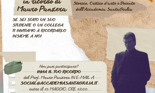 Lunedì 20 maggio, dalle ore 15.00, presso la sede dell’Accademia SantaGiulia, in via Tommaseo 49 a Brescia, si terrà un incontro in memoria dello storico, critico d’arte e Docente dell'Accademia, Mauro Panzera, scomparso il 3 giugno 2013.