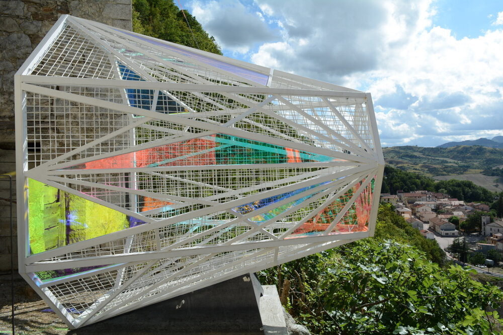 KALEIDOSCOPE è una esperienza sensoriale: una cellula affacciata sul versante della frana verso il nuovo insediamento urbano. Il fruitore entra nella cellula ricevendone una sensazione di protezione ed immersione totale, attraverso il colore generato dagli inserti in vetro con pellicola dicroica, nelle tonalità calde e fredde e in continua mutazione per effetto dell’inclinazione della luce. La struttura è studiata per restituire leggerezza, trasparenza e al tempo stesso forza. La sua posizione ha un duplice scopo: da un lato proteggere e mettere in sicurezza una zona libera scoscesa tra due edifici e dall’altro offrire un inedito punto di vista sul paese “nuovo” di Montebello sul Sangro. Infatti, la collocazione della struttura aggettante e la forma della struttura a cannocchiale con apertura ottagonale e chiusura esagonale, enfatizzano il panorama e la visione del paese. L’installazione ha una doppia vita, diurna e notturna, e quindi pensata affinché la forma sia visibile dal nuovo paese, nelle sue linee minimali e dal colore bianco opaco, come una sorta di astronave atterrata nella notte con il suo bagliore.