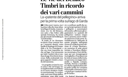 Riportiamo l'articolo uscito su L'Arena in data 14 ottobre 2021, che da nota dello progetto di sviluppo di percorsi di trekking sul lago di Garda, da parte dell'Associazione Le vie del Benaco con il comune di Toscolano. L'Accademia è stata coinvolta nello sviluppo grafico sia per la segnalazione dei percorsi che per la realizzazione dei libretti informativi e delle "credenziali del pellegrino".