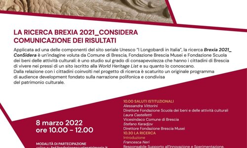 Applicata ad una delle componenti del sito seriale Unesco “I Longobardi in Italia”, la ricerca Brexia 2021_ConSidera è una indagine voluta dalla Fondazione Brescia Musei con il Comune di Brescia e dalla Fondazione Scuola dei beni e delle attività culturali: è uno studio, realizzato da Silvia Rossi, allieva diplomata del corso Scuola del Patrimonio 2018.2020, sul grado di consapevolezza che hanno i cittadini di Brescia di vivere nei pressi di un sito iscritto alla World Heritage List e su quanto lo conoscano.
