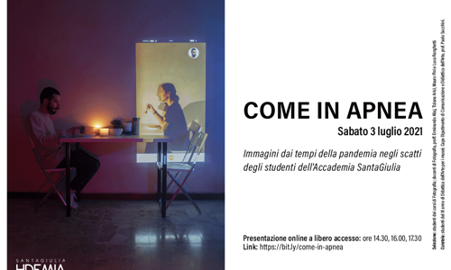 Sabato 3 luglio 2021, sarà presentata online la mostra fotografica COME IN APNEA che raccoglie immagini dai tempi della pandemia negli scatti degli studenti dell'Accademia SantaGiulia.