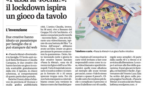 Alleghiamo l'articolo dell'1 maggio 2020 dal Giornale di Brescia, che da nota del gioco da tavolo Passa la 40ena! ideato da Ilaria Bertinazzo e Claudia Campana. Bertinazzo è studentessa del biennio di grafica e Comunicazione dell'Accademia SantaGiulia.