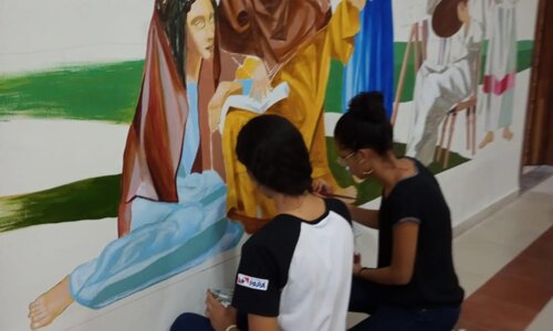 Di uno di questi pannelli gli studenti della nostra Accademia hanno realizzato anche lo spolvero e il bozzetto cromatico, che ne sta permettendo ora l'esecuzione della seconda parte: la riproposizione pittorica, da parte dei ragazzi brasiliani, su un'altra parete dello stesso Istituto.