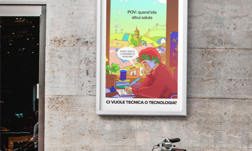 Nella campagna ideata, tramite la tecnica dell’illustrazione, mettiamo proprio i personaggi rinascimentali in relazione con la tecnologia moderna. Nel poster che proponiamo infatti, Dante Alighieri è intento a chiedere ad Alexa (l'assistente digitale per la gestione di dispositivi tecnologici) un suggerimento durante la stesura di un sonetto. L’immagine è inoltre accompagnata da un testo che riprende il meme del POV (Point Of View - Punto di vista), molto popolare sul social TikTok e noto al target scelto.
