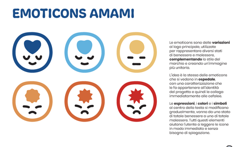 Il logotipo descrive il nome del progetto ed è scritto in maiuscolo per migliorarne la visibilità e dare un’identità più amichevole. La font usata, lobata e senza grazie, rimanda con le sue forme al cervello mantenendo una qualità positiva e vivace. Il pittogramma è costituito da un emoticon felice e rilassata con un cuore al centro della fronte. È la rappresentazione grafica della salute mentale, una mente libera da dolori e preoccupazioni. Lo stile illustrativo ribadisce la positività del progetto. La parte fondamentale del marchio è il carattere, ovvero positività, rilassamento, cura e amore per se stessi.