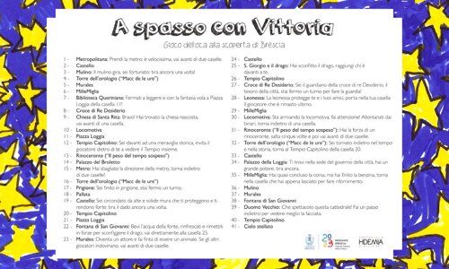 Il Settore infanzia del Comune di Brescia, l’Accademia SantaGiulia e Festival A.Bi.Book hanno presentato, domenica 11 giugno 2023, il progetto "A spasso con Vittoria: Gioco dell'oca alla scoperta di Brescia", un gioco dell’oca gigante che ha coinvolto grandi e piccini in un'esperienza unica all'insegna del divertimento e della cultura.