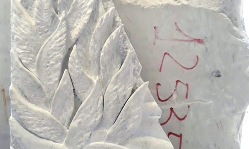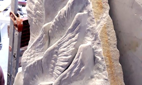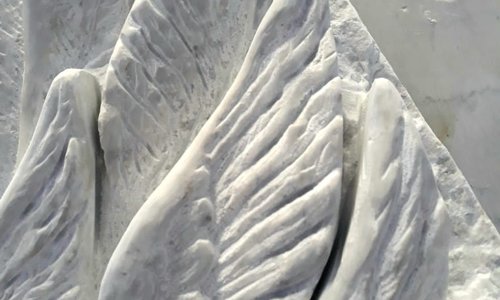 Nella seconda fase abbiamo iniziato a trasformare le dune in ali creando una superficie mossa, dando l’idea del piumaggio. Le piume diventano poi sempre più definite arrivando sino al culmine della lastra di marmo, staccandosi sempre di più dal fondo e creando un chiaroscuro deciso.