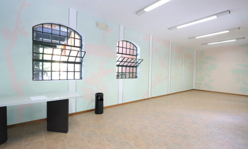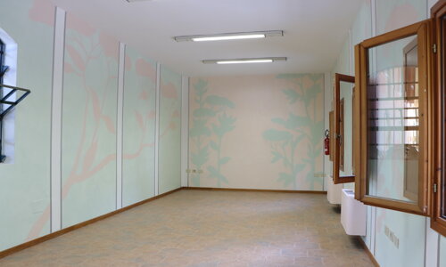 L’intento della proposta decorativa è stato quello di portare la rigogliosa vegetazione visibile dalle finestre all’interno della sala. La struttura compositiva è stata definita da fasce bianche che ripartiscono la stanza. Queste fasce, che si uniscono al soffitto attraverso il colore, abbinate alla decorazione arborea possono ricordare un patio percorribile. La vegetazione rappresentata è composta da rami di pesco e di sambuco, entrambi alberi fioriti e presenti sul territorio bresciano. La scelta di una tematica neutra è stata dettata dagli impieghi che questa sala ha, che sono dei più vari.