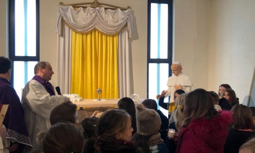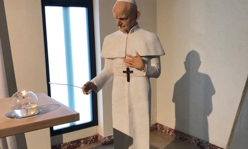 Per la realizzazione gli studenti si sono ispirati da una storica fotografia di Pepi Merisio che ritrae il Papa nel momento in cui accende una lampada ad olio; per questo motivo la sua collocazione è pensata in ingresso alla Chiesa (o in uscita) e l’unico lume accesso è quello simbolicamente alimentato dalla mano del Santo. Gli altri lumi predisposti sull’altare non sono da accendere al Santo ma da portare a casa o nel luogo dove si chiede al Santo il dono della Luce che lui stesso fa.