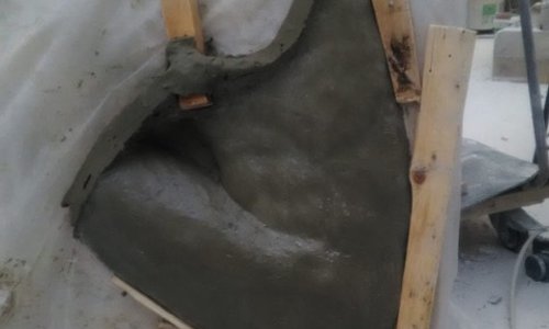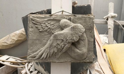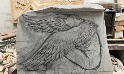 In questa fase si definiscono le forme e si aggiungono dettagli. I ragazzi hanno utilizzato la gradina (per il bassorilievo e le parti anatomiche), la mole di diamante (per dare omogeneità nei dettagli della superficie), il martello pneumatico. Per il soggetto di questa scultura, nella parte dell'ala piumata, i ragazzi sono intervenuti con una mole dalla punta sottilissima e hanno poi fissato il disegno con uno strato di resina. - Levigatua e lucidatura