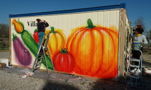 La sede del villaggio necessitava di una maggiore visibilità. È punto di riferimento per gli utenti: si trova immersa in un grande appezzamento che conta più di 240 orti dati in affitto annuale a privati, famiglie e alle scuole primarie che svolgono attività didattiche legate all’orticoltura.