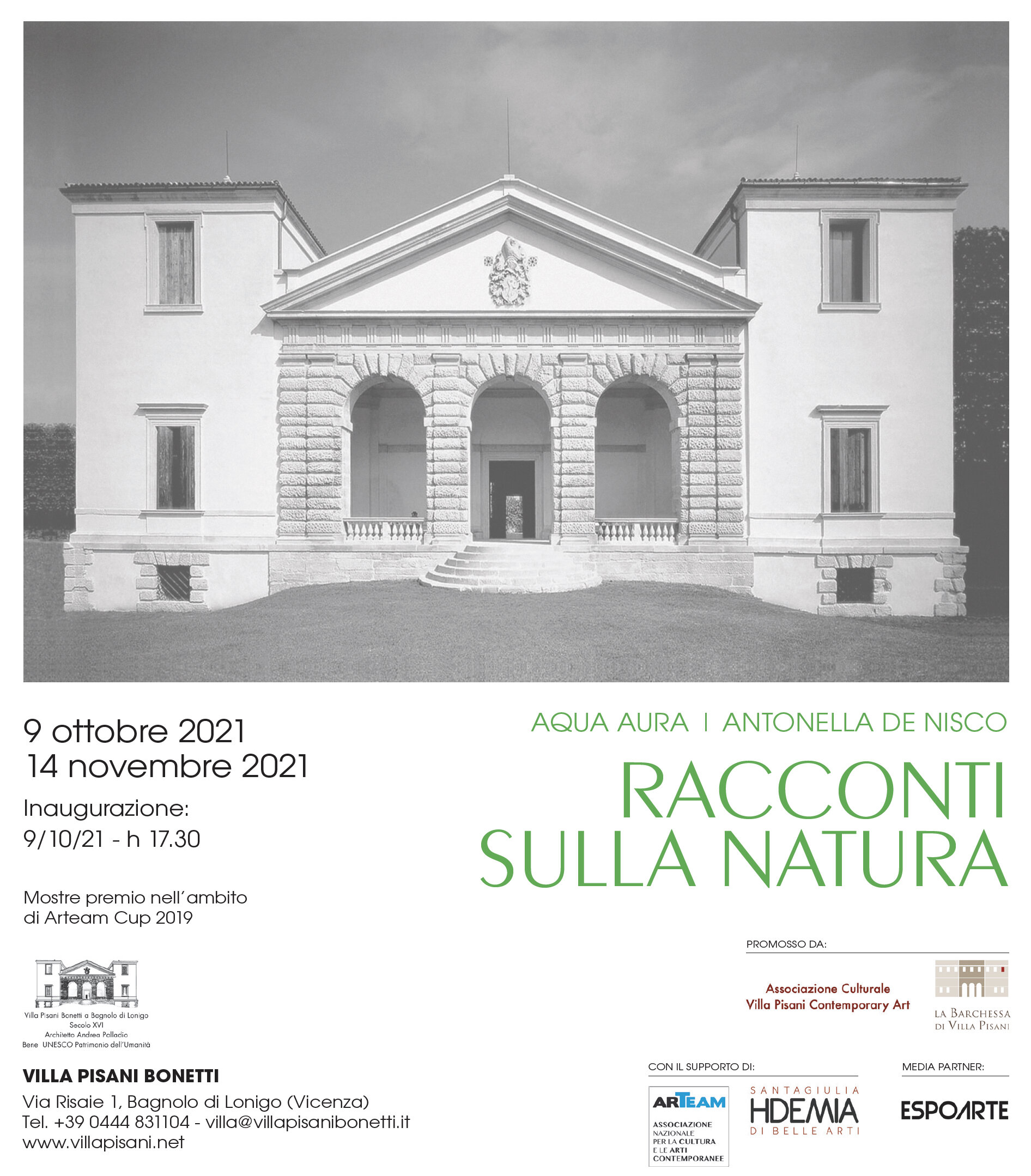 Inaugura sabato 9 ottobre 2021, e sarà visitabile fino al 14 novembre 2021, a Villa Pisani Bonetti (Via Risaie 1, Bagnolo di Lonigo) in provincia di Vicenza, RACCONTI SULLA NATURA, duplice mostra che vede protagonisti gli artisti Aqua Aura e Antonella De Nisco.