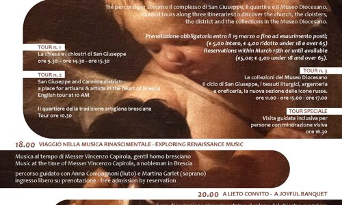 La giornata di domenica 19 marzo vedrà protagoniste numerose attività per scoprire i tesori nascosti del Complesso di San Giuseppe (via Vicolo S. Giuseppe 5, Brescia) tra cui visite guidate (di cui una in inglese e una per persone con minorazione visiva), laboratori per bambini e ragazzi sulla rievocazione degli antichi mestieri, un concerto di musica rinascimentale e molte altre.