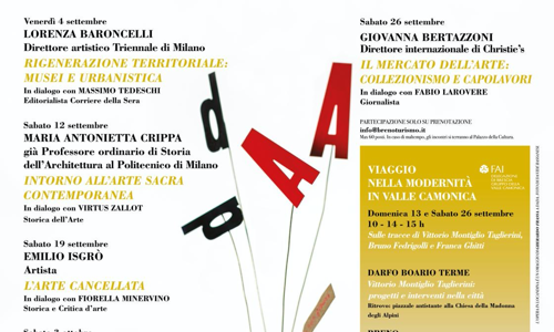 L'Accademia SantaGiulia ha il piacere di segnalare l'evento e in particolare l'incontro del 12 settembre 2020 (Darfo Boario Terme - Chiostro dell'ex convento, via Quarteroni, ore 20.30) che vedrà protagoniste Maria Antonietta Crippa, Professore ordinario di St. dell'Architettura al PoliMI, in dialogo con Virtus Zallot, Storica dell'Arte e Docente presso l'Accademia SantaGiulia di Brescia.