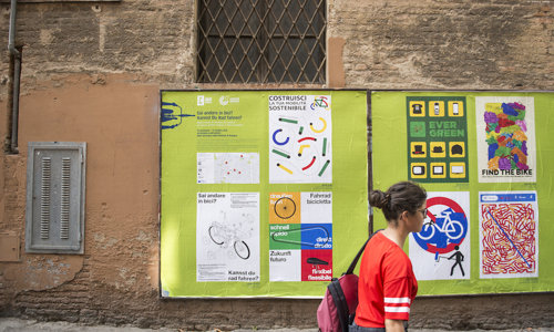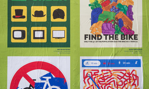 L'esposizione dei 40 progetti selezionati è visibile nelle strade del centro storico di Bologna per promuovere l’uso della bicicletta. Il concorso al quale Silvia Gastaldello ed altri studenti hanno partecipato liberamente, durante il corso di Graphic Design tenuto dalla Prof.ssa Francesca Rosina, è bandito dal Goethe-Institut Rom, in collaborazione con CHEAP e Aiap, Associazione italiana design della comunicazione visiva.