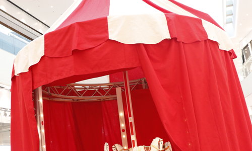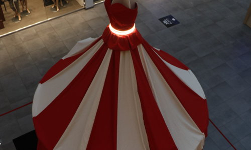 Sul davanti l'abito si apre in due come una tenda e dentro si intravede una giostra di cavalli. L'idea è quella di una donna contemporanea che nasconde e custodisce ancora dentro di se un fantastico mondo immaginario, legato ai ricordi dell'infanzia. L'intera installazione è alta oltre 5 metri ed ha un diametro alla base di circa 3,5 metri ed è rifinito esternamente con strisce led ed inserti luminosi e all'interno è allestita una giostra di cavalli con le classiche luci di un luna park.