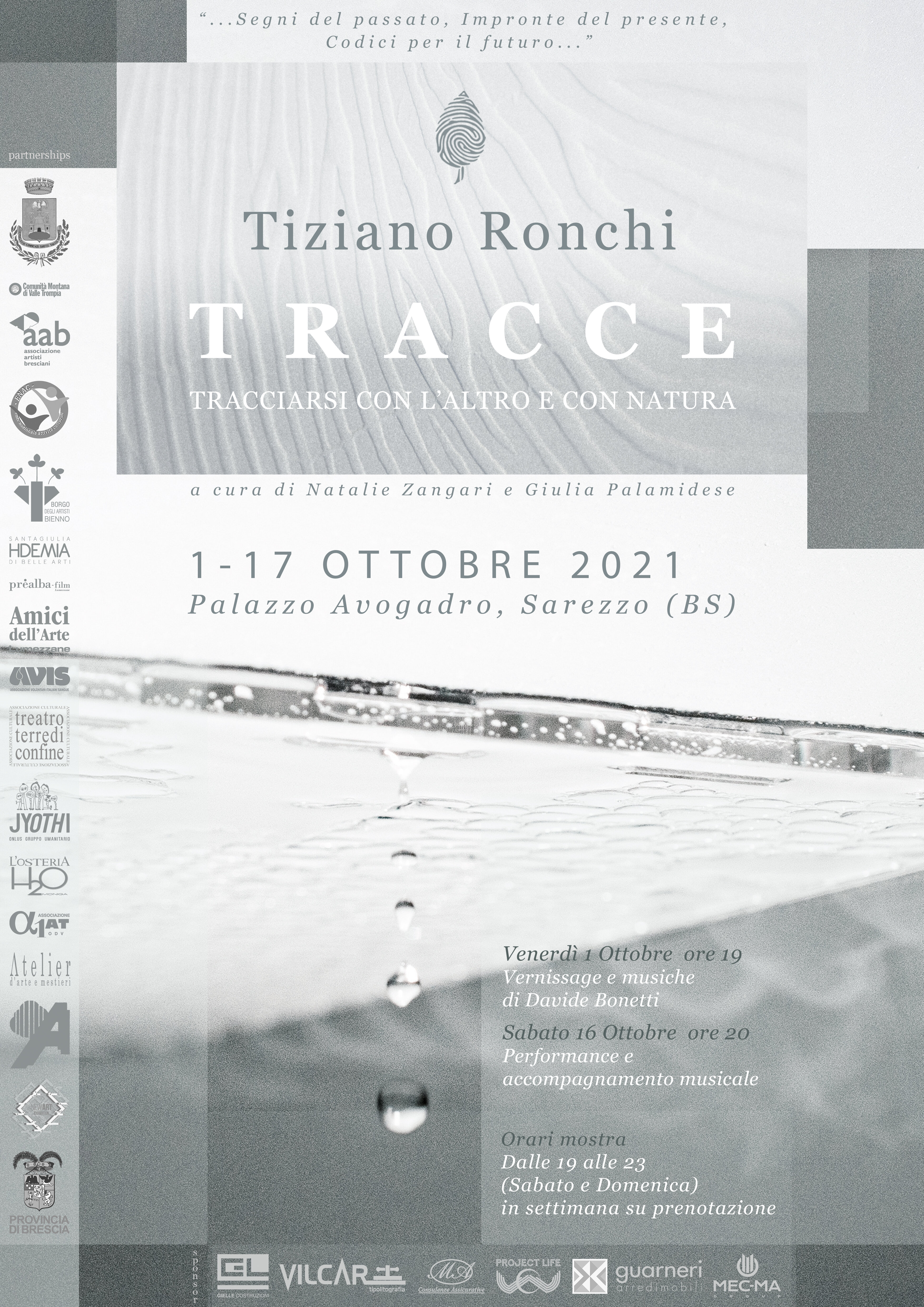 Venerdì 1 Ottobre 2021, alle ore 19.00, presso il Palazzo Avogadro di Sarezzo, Brescia (via Gremone, 2), si inaugura TRACCE., mostra personale dell’artista Tiziano Ronchi, ex studente del biennio specialistico di Arti Visive Contemporanee, a cura di Giulia Palamidese e Natalie Zangari.