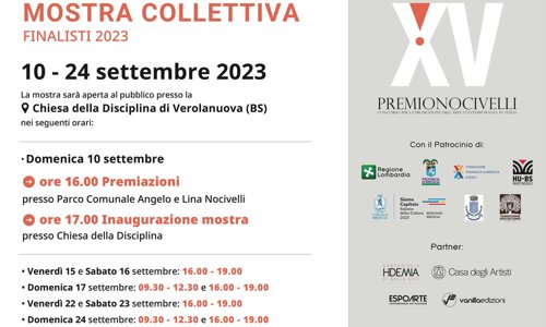 Domenica 10 settembre 2023 a Verolanuova si terrà la premiazione dei finalisti del Premio Nocivelli 2023 e l'inaugurazione della mostra con le opere dei 30 finalisti in gara.